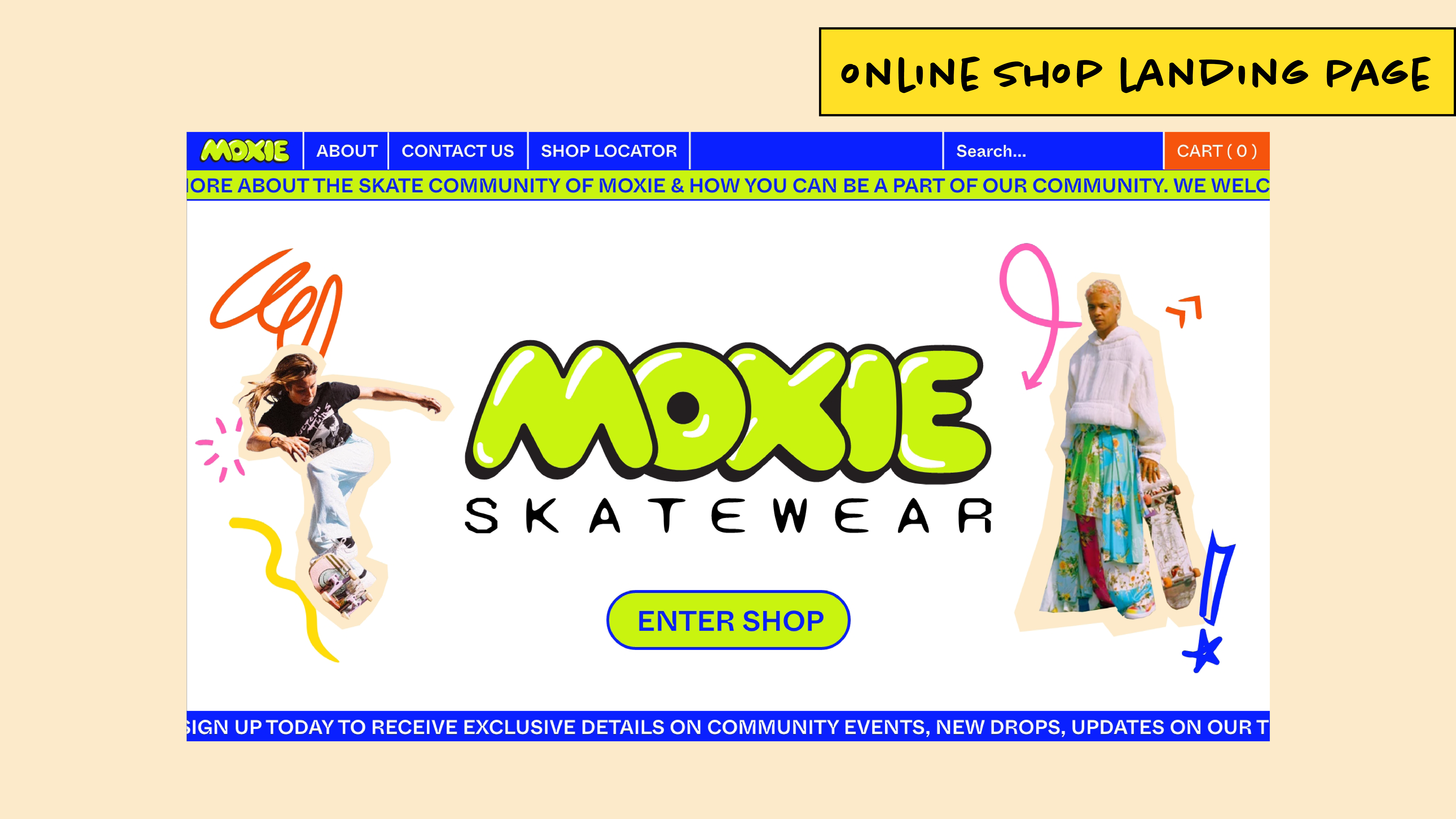 A retail brand’s visual identity for a sustainable, inclusive skatewear brand, Moxie, showcased through process slides.